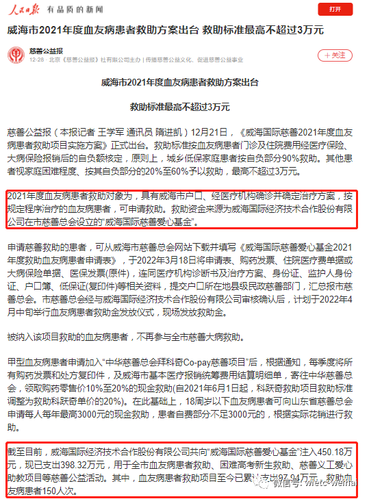 2021年12月21日,《威海國際慈善2021年度血友病患者救助項目實施方案》正式出臺,明確了“威海國際慈善愛心基金”2021年度對血友病患者的救助范圍、救助標(biāo)準(zhǔn)及申請救助渠道等,并介紹了公司設(shè)立的“威海國際慈善愛心基金”有關(guān)情況。