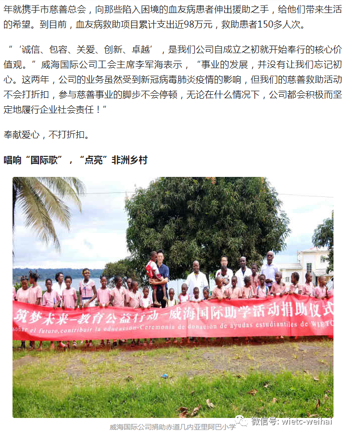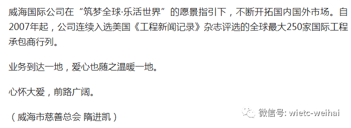 按:威海國(guó)際公司在30多年的發(fā)展歷程中,始終秉持“關(guān)愛”理念,熱心公益慈善事業(yè)。無論在國(guó)內(nèi)還是在海外,公司業(yè)務(wù)做到哪里,愛的火炬就傳到哪里,贏得了社會(huì)各界廣泛贊譽(yù)。近日,威海市慈善總會(huì)聯(lián)系齊魯晚報(bào)、威海傳媒網(wǎng)、大眾網(wǎng)、今日頭條、搜狐新聞等多家媒體,對(duì)公司積極回饋奉獻(xiàn)社會(huì)的善舉,作了題為“譜好‘愛心曲’ 唱響’國(guó)際歌’”的紀(jì)實(shí)報(bào)道。