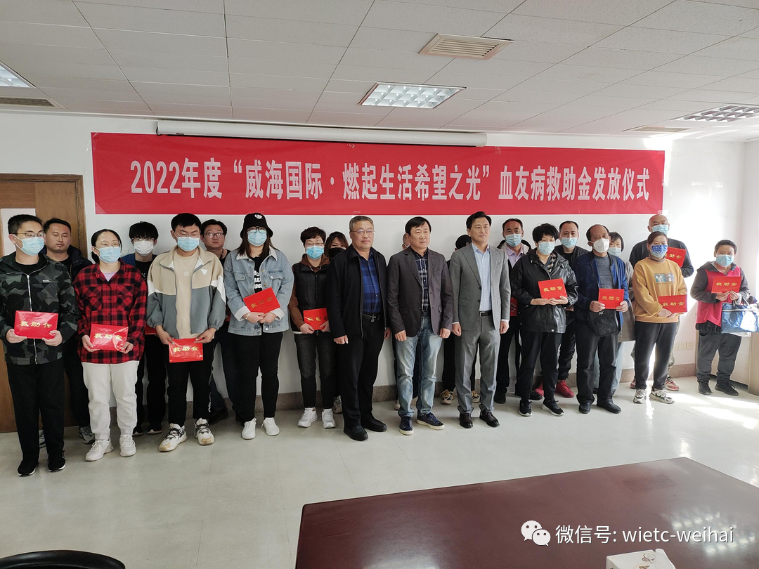 4月15日,在第35個(gè)世界血友病日來臨之際, “威海國際·燃起生活希望之光”血友病救助金發(fā)放儀式在公司五樓會(huì)議室舉行,向22名患者發(fā)放了16.428萬元救助金。威海市民政局副局長苗家,社會(huì)救助服務(wù)中心主任、慈善總會(huì)名譽(yù)副會(huì)長王明源,公司工會(huì)主席李軍海出席儀式。