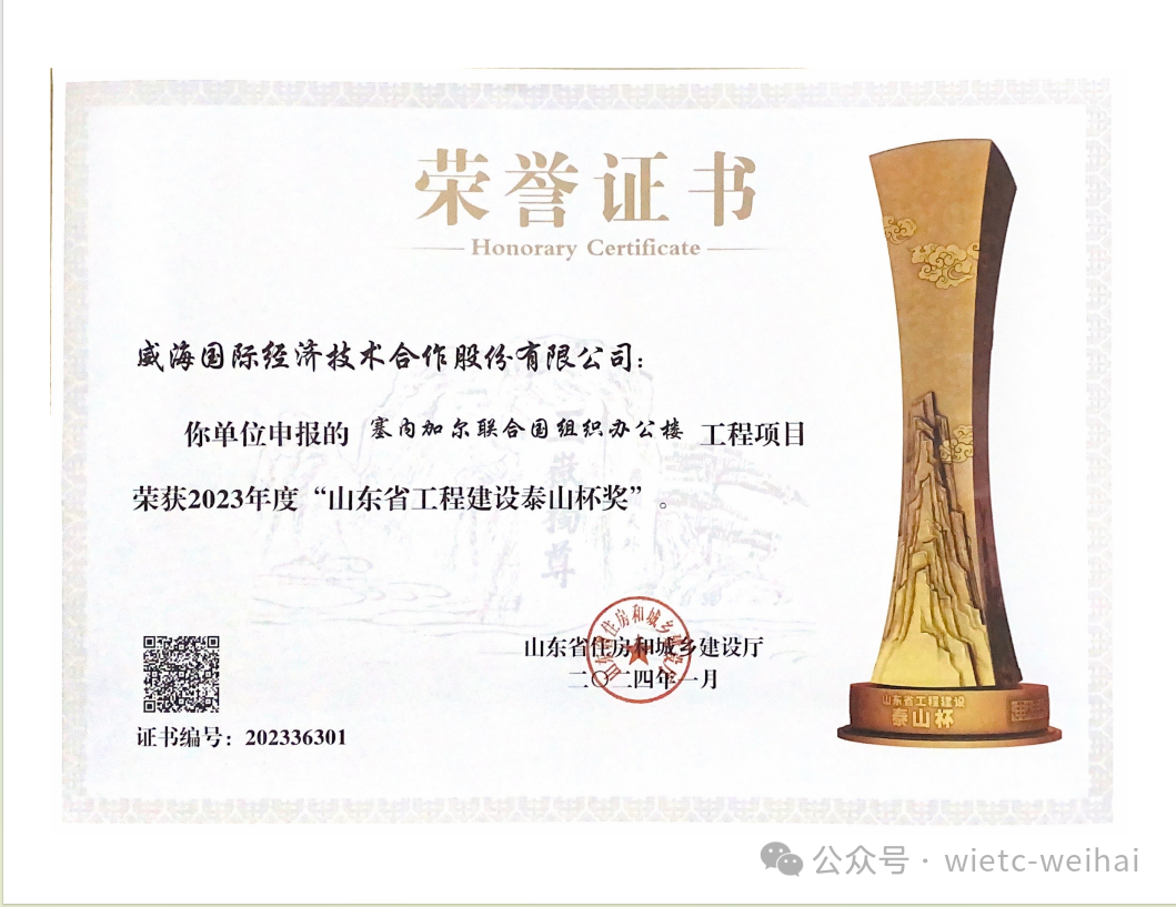 公司以PPP模式建設(shè)的塞內(nèi)加爾聯(lián)合國(guó)組織辦公樓項(xiàng)目榮獲2023年度“山東省工程建設(shè)泰山杯獎(jiǎng)”。近日,山東省住房和城鄉(xiāng)建設(shè)廳頒發(fā)了榮譽(yù)證書。這是公司海外工程項(xiàng)目首次獲此殊榮,可喜可賀。